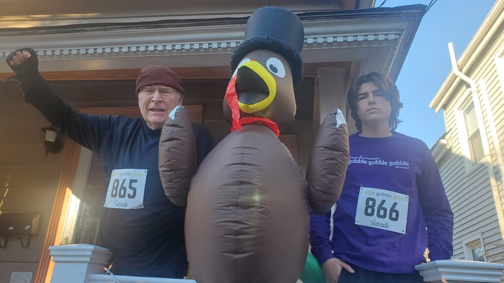 The WHOLE FAMILY agreed to participate in the Somerville Road Runners Gobble Gobble Gobble, a 4-mile road race on Thanksgiving morning. Twin V is not normally a distance runner, but he “won the family” which was his goal. (I won’t go into the gory details about his situation afterwards, but he claims it was worth it.) Twin S was not far behind him, displaying his typical nonchalance. Daddio and I were just happy to finish with no injuries, but I did get a faster time than I expected! There’s something to be said for low expectations.