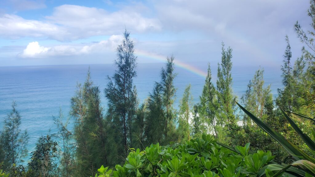 It was hard to feel too disappointed. The beach hike is obviously much shorter, but still strenuous. And it is truly spectacular. These first two miles contain some of Kaua’i’s most iconic views – the stuff of picture postcards and travel guidebooks (ahem). The rusty red trail stretches out ahead, traversing emerald-clad cliffs that drop into aquamarine waters. Dense, chaotic, verdant life crowds out the hillsides on either side of the trail. Overhead, overcast skies tease with rain, until a rainbow bursts through the clouds. It was such a fantastic day, one that left me filled with wonder and gratitude for our gorgeous Mother Earth.