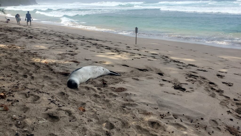 Wildlife report: One monk seal napping on the beach. He was gigantic. Apparently, they just go to sleep in the middle of the beach and they look like they are dead. The park rangers put little signs around them telling people to leave them alone. (No wonder they are endangered.)