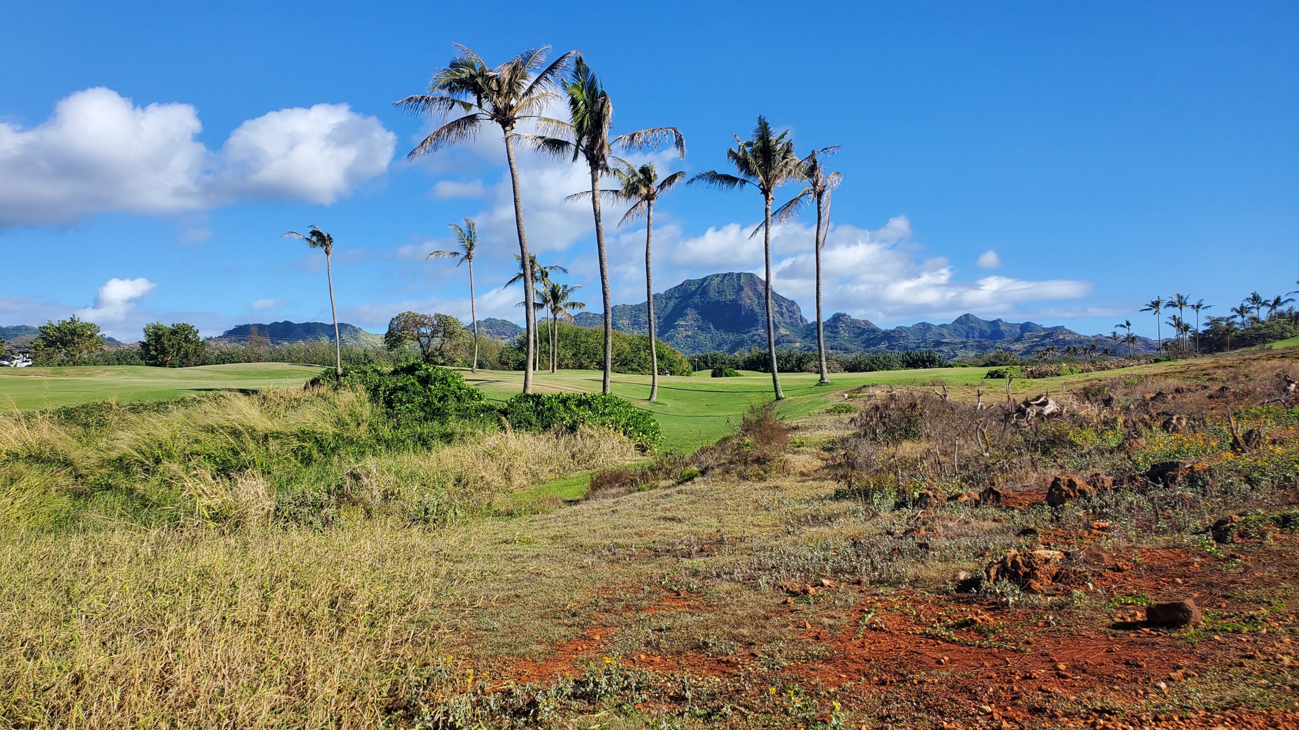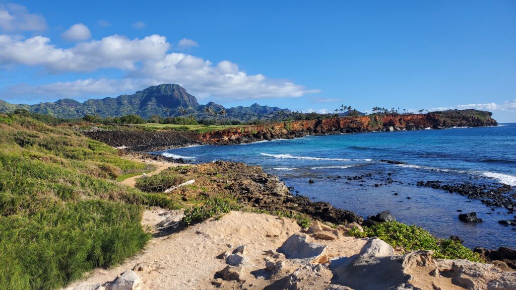 Kaua’i is definitely good for scenic golf courses (as I discovered during my first week). For a while the Mahaʻulepu Heritage Trail skirts the oceanside Poʻipū Bay Golf Course, with the rugged Haupu Mountains as a backdrop.