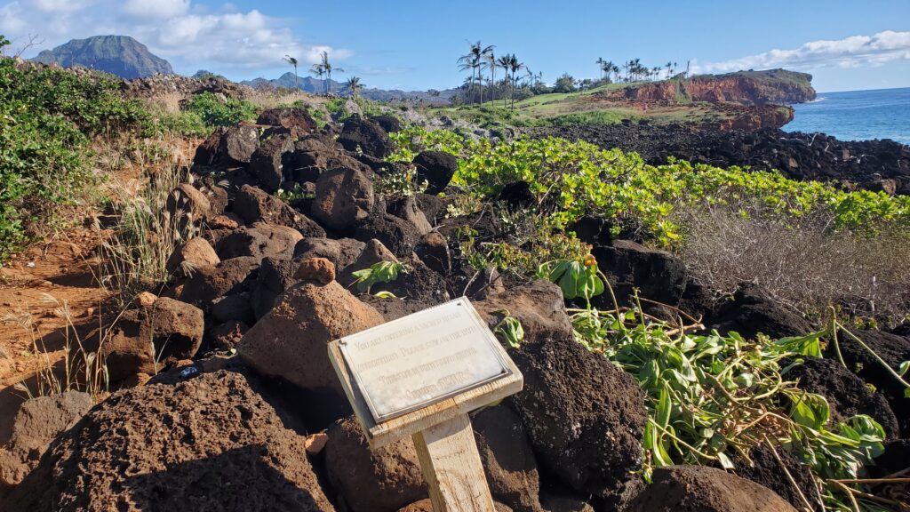 On the ocean side of the trail, there are limestone and sandstone pinnacles and lava rock tidepools. High walls of black boulders stretch down to the ocean, marking the site of an ancient temple known as Heiau Ho‘oului‘a.